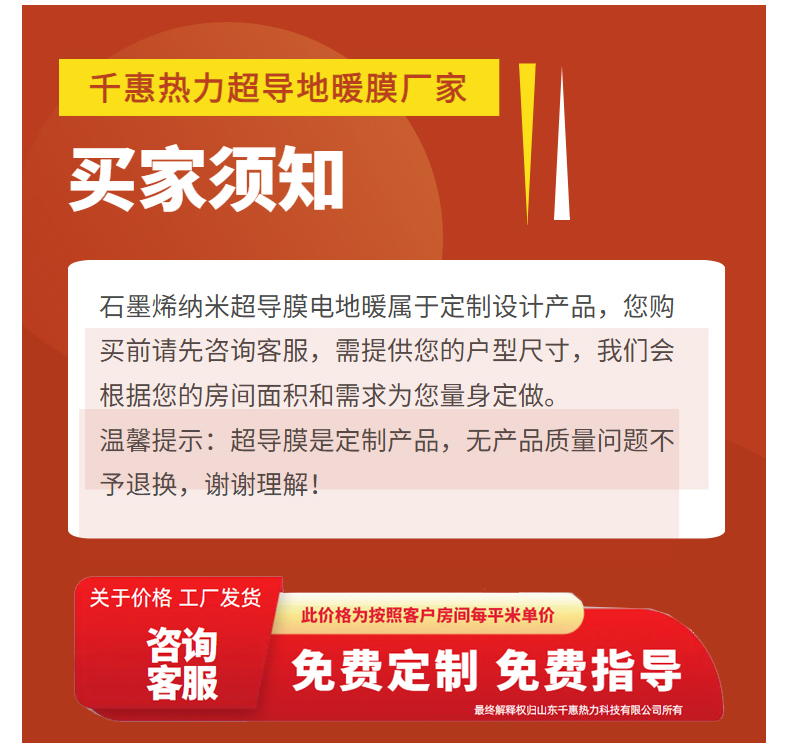 山东千惠热力科技有限公司2025年新品推出石墨烯超导膜电地暖,减少铺线工艺施工便捷,一人即可铺设。石墨烯超导膜通电升温快,智能控温,灵活采暖便捷。可根据采暖需求进行灵活性控温。